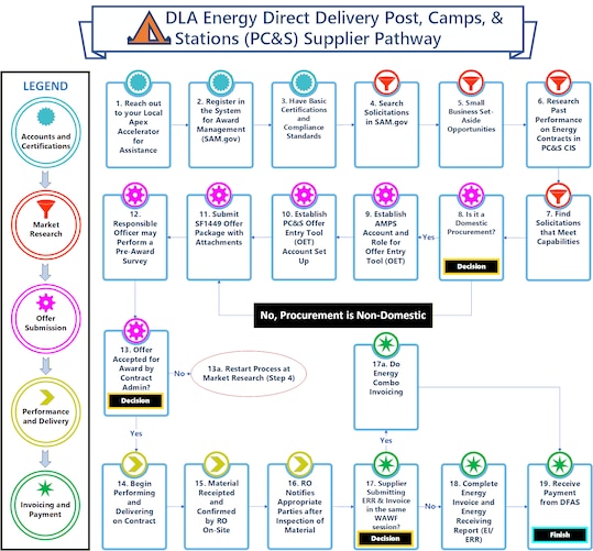 The DLA Energy Direct Delivery PC&S Supplier Pathway showing how a direct delivery petroleum fuels provider can work with the DLA Energy Business Unit from accounts and basic certifications needed to invoicing and payment guidance.