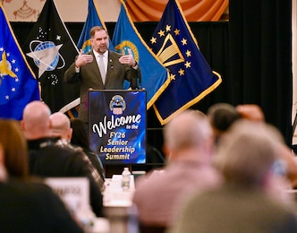 DLA Disposition Services Director Mike Cannon addresses attendees at the major subordinate command’s annual leadership summit in Battle Creek, Michigan, Jan. 27.