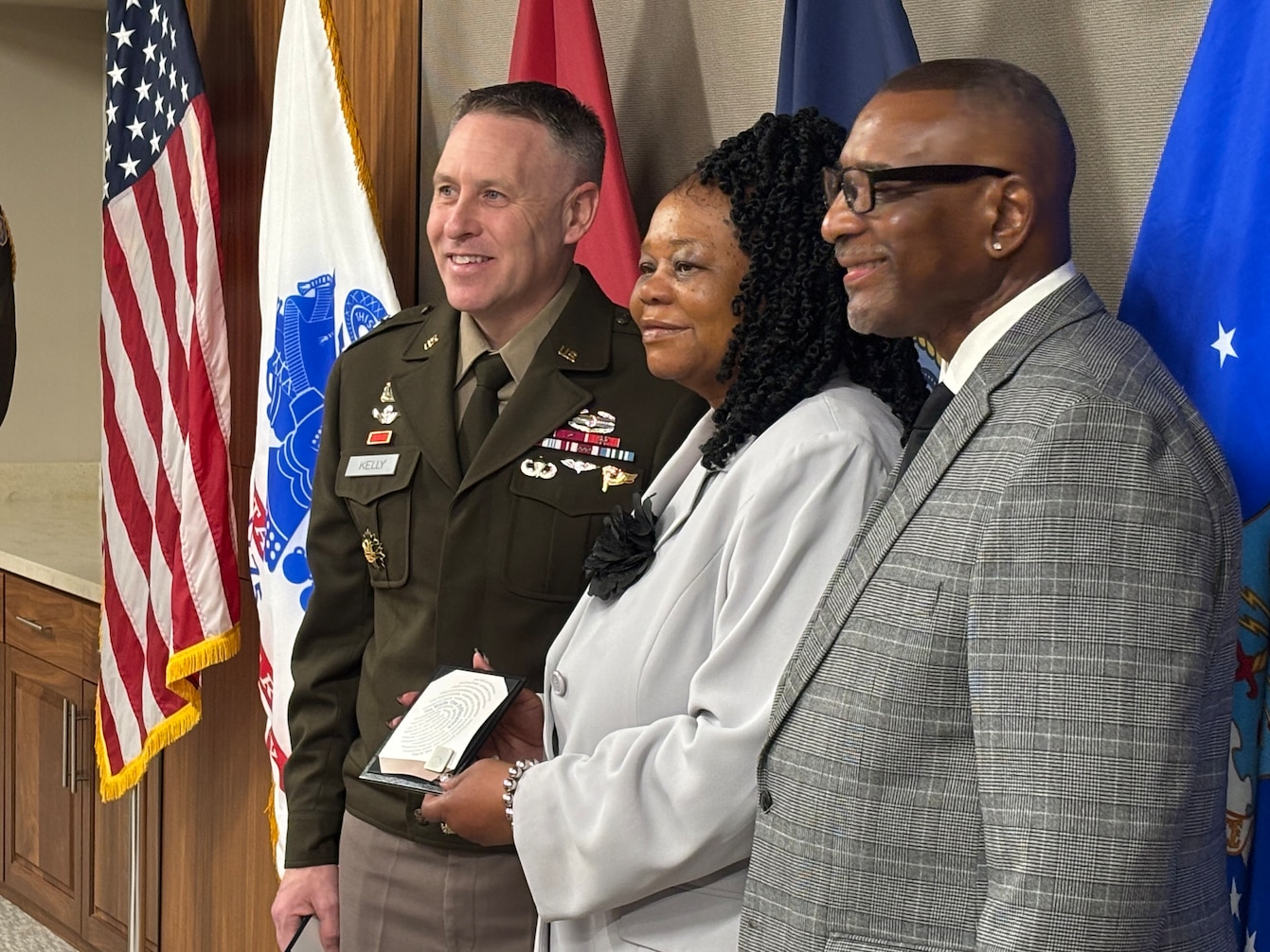 DLA Troop Support Commander Army Brig. Gen Sean P. Kelly stands next to Cynthia Mitchell-Riley, joined by her husband Reginald, during her retirement ceremony from Troop Support in Philadelphia on Feb. 12.