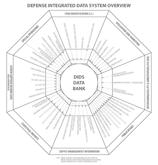 Graphic depicting data flows in eight Defense Integrated Data System categories. Provided to the General Accounting Office in December 1977 and reproduced by DLA Public Affairs. (DLA graphic by Brian Dumas)