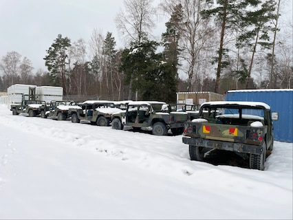 High Mobility Multipurpose Wheeled Vehicles are positioned at U.S. Army Garrison Grafenwoehr, awaiting disposal by Defense Logistics Agency Disposition Services, as part of the U.S. Army’s divestiture of excess initiative. The Army is replacing hundreds of Humvees throughout Europe and will divest approximately 300 through DLA. The agency’s Grafenwoehr site will manage 190 turn ins and receive vehicles in groups of 25 under a Receipt-in-Place agreement due to the limited yard space available. (Courtesy photo by Jesse Briggs)