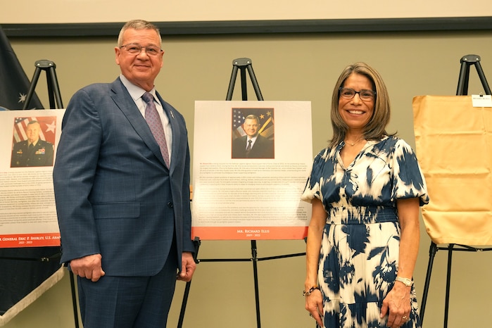 Former DLA Troop Support Deputy Commander Richard Ellis, left, unveils his Hall of Fame plaque with his wife, Doreen during a ceremony in his honor April 2, 2026, in Philadelphia, Pennsylvania. Ellis is one of four former leaders inducted into the DLA Troop Support Hall of Fame, established in 1994 to recognize former employees who’ve made significant and enduring contributions to the organization.