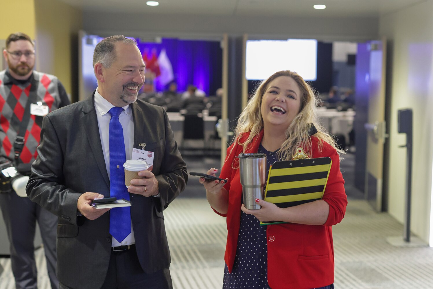 Defense Logistics Agency Land and Maritime Protocol Officer Terri Johnson and Defense Supply Center Columbus Installation Deputy Site Director Mike Wood let loose during a networking break April 6 at the 2022 DLA Land and Maritime Supplier Conference and Exhibition.