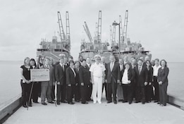 The government and industry SEA Card team commemorates the SEA Card launch by posing on a Virginia pier with DLA Director Vice Adm. Keith Lippert and Defense Energy Support Center Director Richard Connelly.