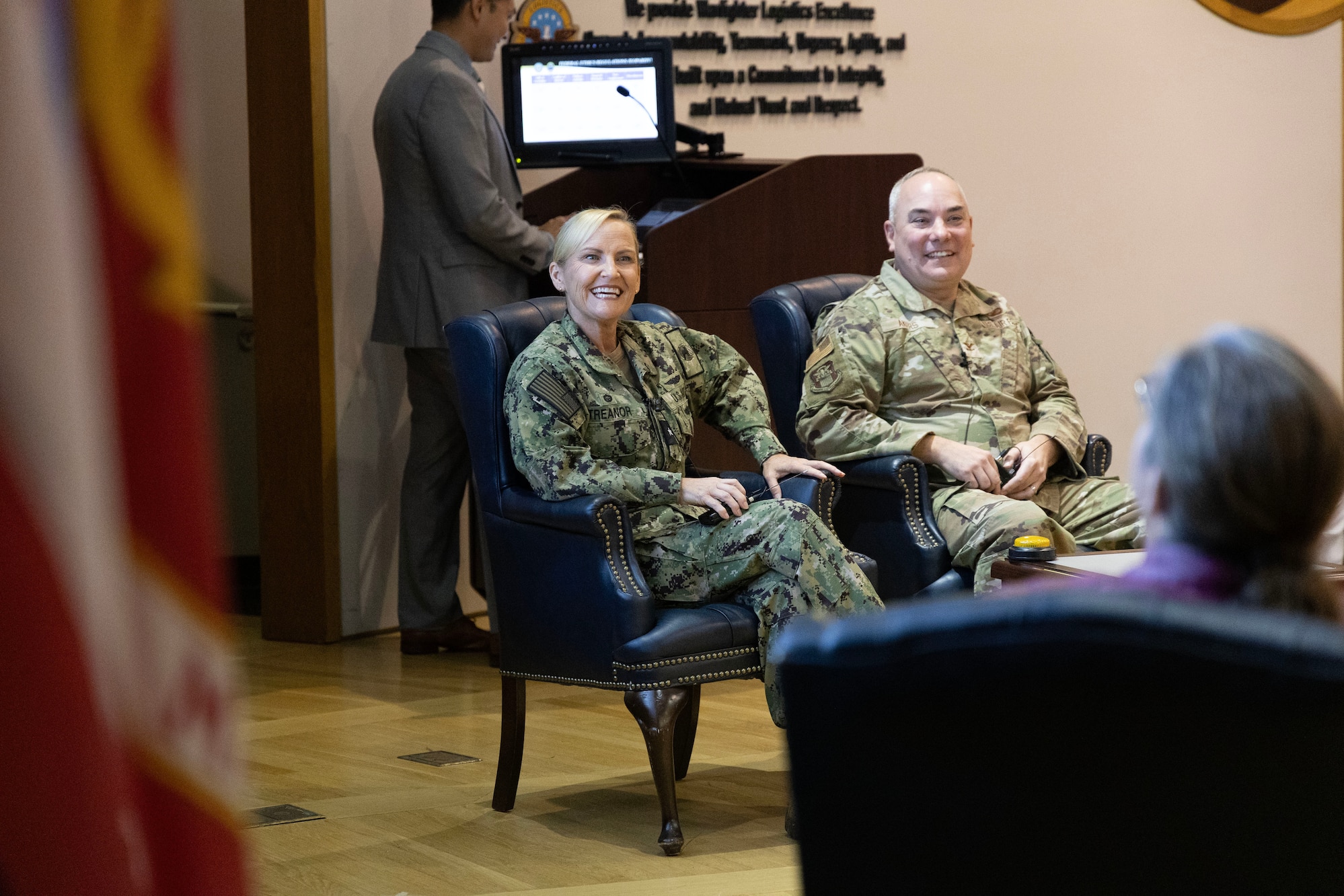 Defense Logistics Agency Weapons Support (Columbus) Commander Navy Rear Adm. Julie Treanor (center) and DLA Weapons Support (Columbus) Chief of Staff Air Force Col. Lee Akers share a laugh during a Jeopardy!-style Annual Ethics Training event at Defense Supply Center Columbus Oct. 7. The event, dubbed “Federal Ethics Regulations Jeopardy!” mirrored the popular game show, complete with buzzers and a realistic game board of relevant ethics categories displayed on the big screen. (Photo by Stefanie Hauck/DLA)