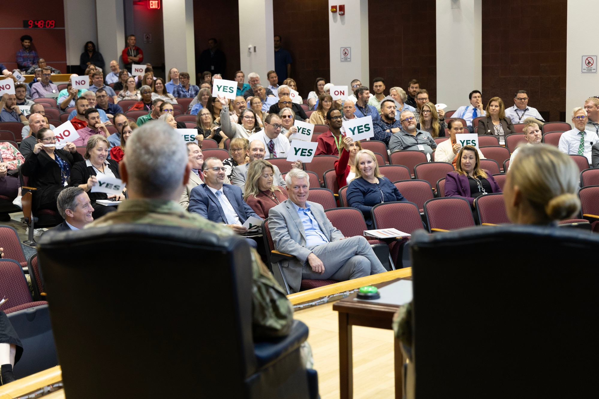During a Jeopardy!-style Annual Ethics Training event at Defense Supply Center Columbus Oct. 7, Defense Logistics Agency Weapons Support (Columbus) employees use "Yes/No" cards to agree or disagree with answers provided by contestants on stage. Dubbed “Federal Ethics Regulations Jeopardy!” the event mirrored the popular game show, complete with buzzers and a realistic game board of relevant ethics categories displayed on the big screen. (Photo by Stefanie Hauck/DLA)