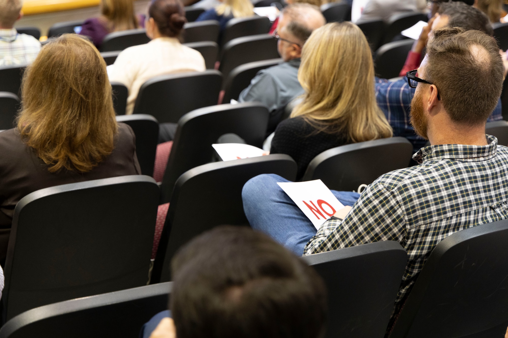 During a Jeopardy!-style Annual Ethics Training event at Defense Supply Center Columbus Oct. 7, a Defense Logistics Agency Weapons Support (Columbus) employee sits with his “Yes/No” card as he watched DLA Weapons Support (Columbus) leaders and one volunteer from the audience play a Jeopardy!-style game dubbed “Federal Ethics Regulations Jeopardy!” (Photo by Stefanie Hauck/DLA)