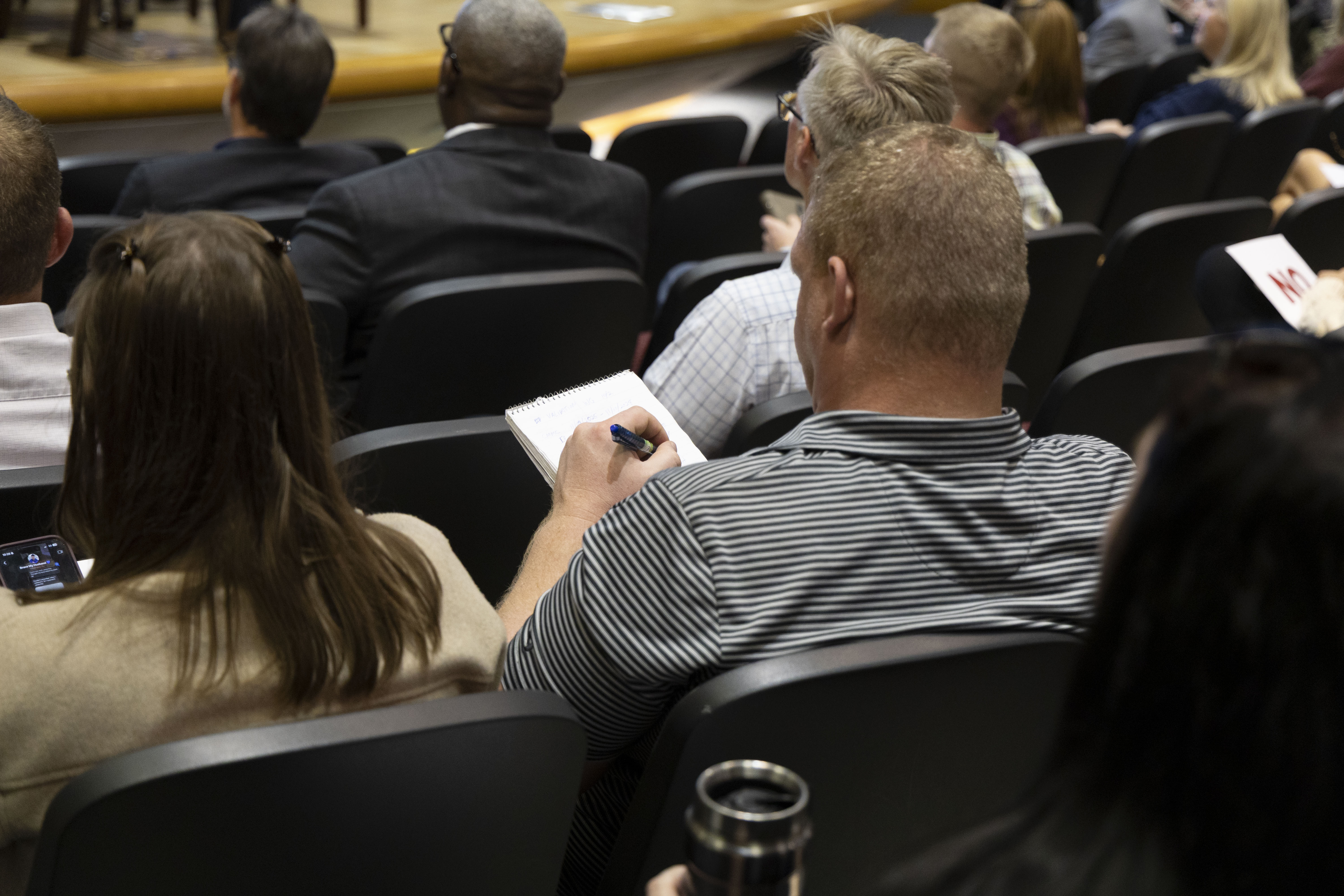 An employee takes notes as he listens to Defense Logistics Agency Weapons Support (Columbus)’ Legal Office ethics counselors during a Jeopardy!-style Annual Ethics Training event at Defense Supply Center Columbus Oct. 7. DLA Weapons Support (Columbus) leaders – and one volunteer from the audience – acted as contestants in the game show dubbed “Federal Ethics Regulations Jeopardy!” (Photo by Stefanie Hauck/DLA)