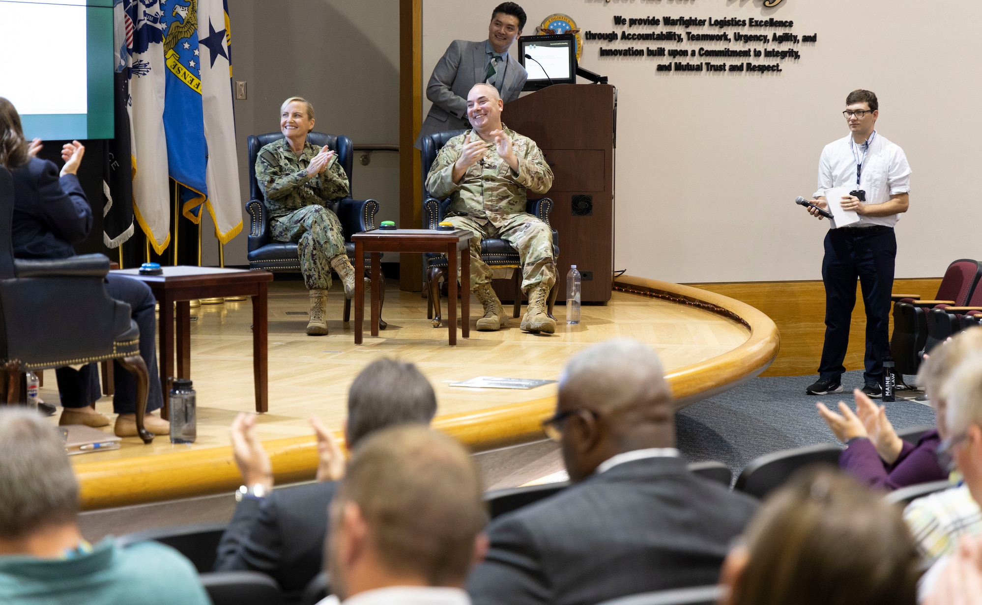 During a Jeopardy!-style Annual Ethics Training event at Defense Supply Center Columbus Oct. 7, contestants Defense Logistics Agency Weapons Support (Columbus) Commander Navy Rear Adm. Julie Treanor (center) and DLA Weapons Support (Columbus) Chief of Staff Air Force Col. Lee Akers (to her right), applaud after Final Jeopardy. (Photo by Stefanie Hauck/DLA)