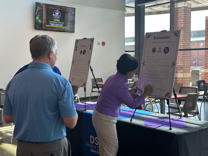 Ursula Hickox, Chief of the Defense Supply Center Richmond Family and Morale, Welfare and Recreation Office, and, David Gibson, site director for DSCR Installation Management Richmond, sign proclamations officially recognizing April as National Child Abuse Prevention Month and the Month of the Military Child during a ceremony held April 1 on DSCR, Virginia. The ceremony brought together members of the DSCR community, emphasizing the critical importance of creating a safe and nurturing environment for all children. (Photo by Dominique Shelton)