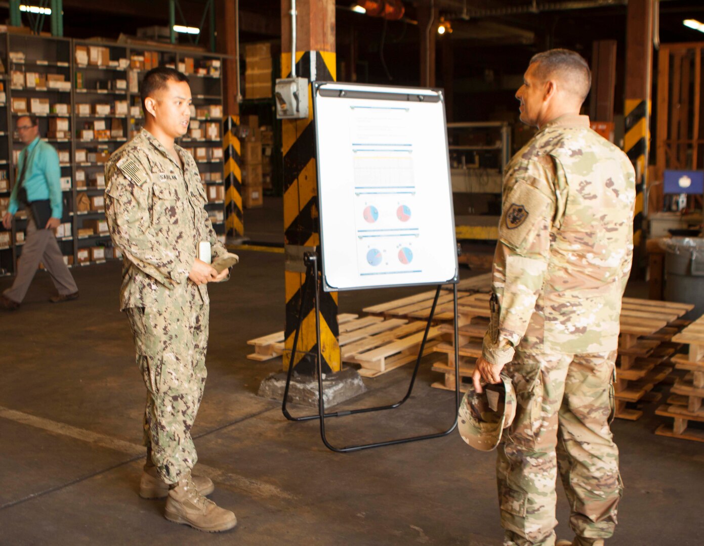Laskodi toured the disposition mission, thanking the operation’s employees for their dedication to the mission, before visiting the Navy Advanced Traceability and Control Mission Area. There, Navy Lt. Darren Sablan, supply officer within the bulk division, showed Laskodi how Navy depot-level repairables items are stored until the Navy requires them to be repaired and re-used, rather than purchasing new items.