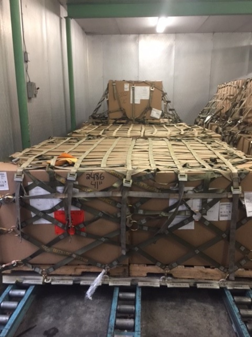 The DLA Distribution Norfolk East Coast Export Mission Team loaded and shipped over 95,000 lbs. of fresh fruit and vegetables; more than 5,000 dozen eggs; nearly 17,000 lbs. of dairy products; 13,000 lbs. of dry food items; and nearly 2,000 lbs. of frozen foods. The items were shipped on 463L air pallets and flown on September 15.
