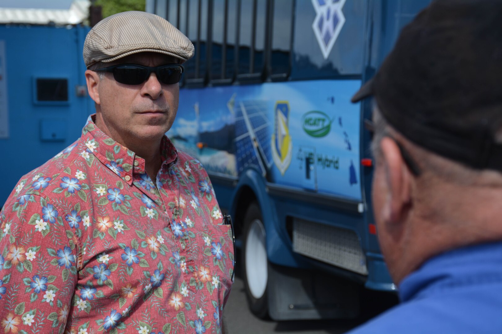 Director of the Hawaii Center for Advanced Transportation Technologies, Stan Osserman, center, briefs subject matter experts for the Air Force Civil Engineer Center Mike Rits, left, and Tarone Watley, right, on the capabilities of the hydrogen electrolyzer and supported vehicles located at Joint Base Pearl Harbor-Hickam, Hawaii, Dec. 12, 2017. (U.S. Air Force photo by J. Brian Garmon)