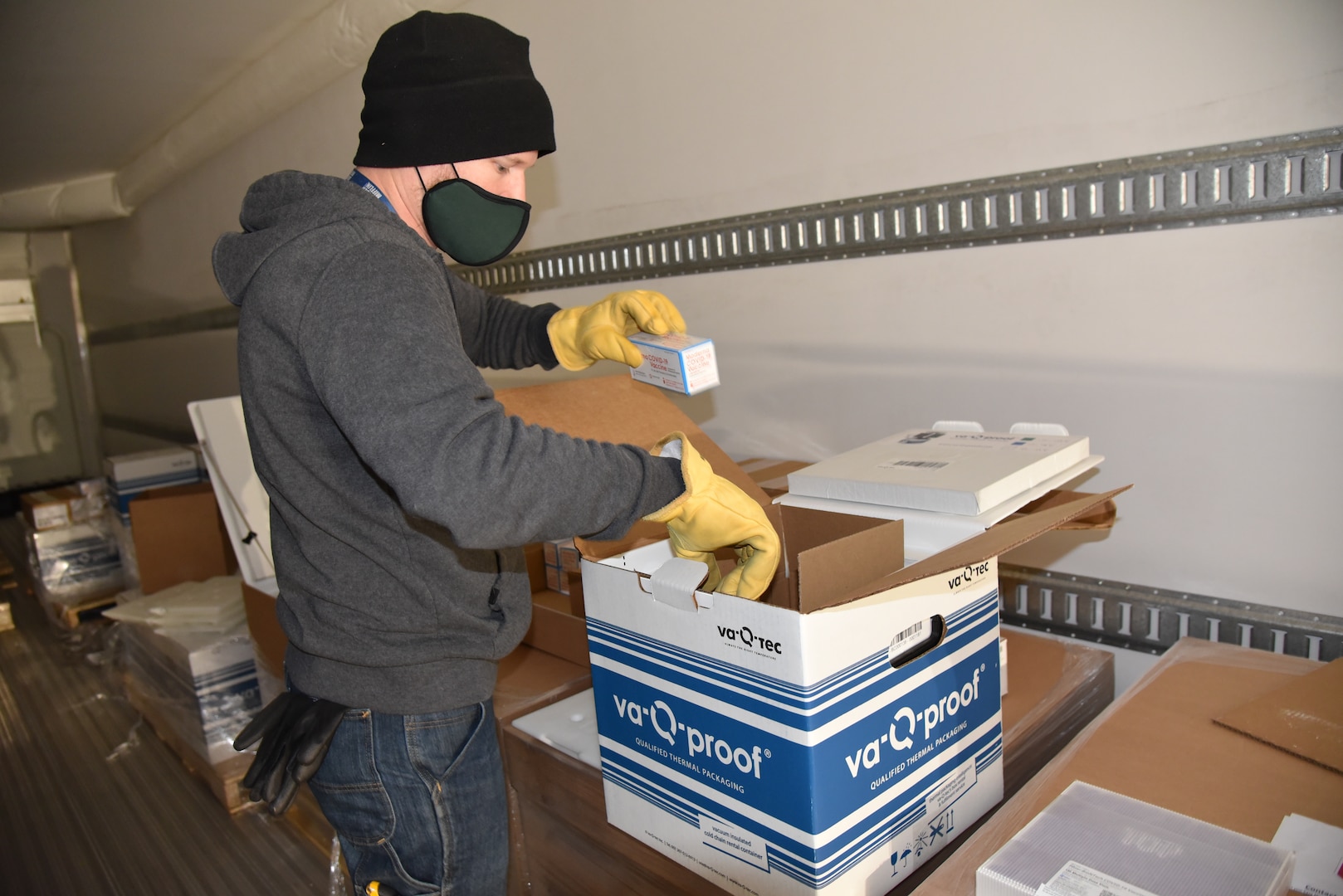 The COVID-19 vaccines require additional measures to sustain the proper temperature. Refrigerated trucks, dry-ice, gel packs, specialized cold-chain management training for employees and specialized cold gear including insulated suits, gloves, face masks and boots are provided for employees to wear while working with the shipments inside the temperature-controlled storage containers.