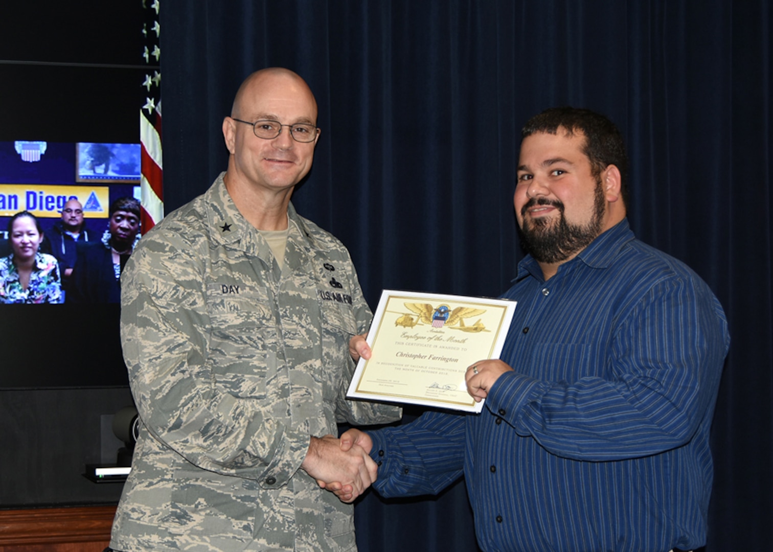 Defense Logistics Agency Aviation’s October Employee of the Month is Christopher Farrington. He serves as a project manager for the Industrial Plant Equipment Services Division of DLA Aviation’s Engineering Directorate in Richmond, Virginia. DLA Aviation Commander Air Force Brig. Gen. Allan Day presented the award to Farrington during a ceremony Nov. 25.