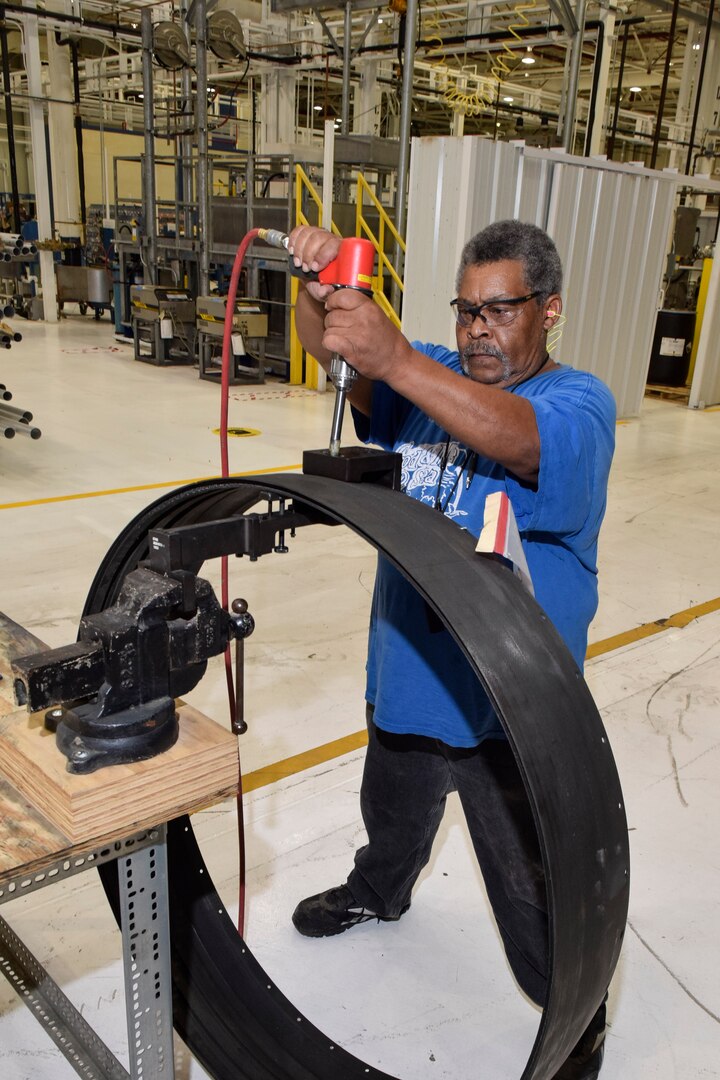 KC-135 Stratotanker ruddervators are shown in two distinct stages of remanufacture by members of the 553rd Commodities Maintenance Squadron, Oklahoma City Air Logistics Complex, July 25, 2016, Tinker Air Force Base, Okla. Tradd Baggott, 553rd CMMXS composite fabricator works on the the ruddervator on the left which uses original components in the form of a steel tube and small section of honeycomb core around which the rest of the airfoil is built using the template table. Patrick Harkless, right, cleans and inspects a finished ruddervator ready to be returned to the supply system. The 553rd CMMXS manufactures and maintains components for KC-135, B-1B, B-52H, E-3 and E-6 aircraft. (U.S. Air Force photo/Greg L. Davis)