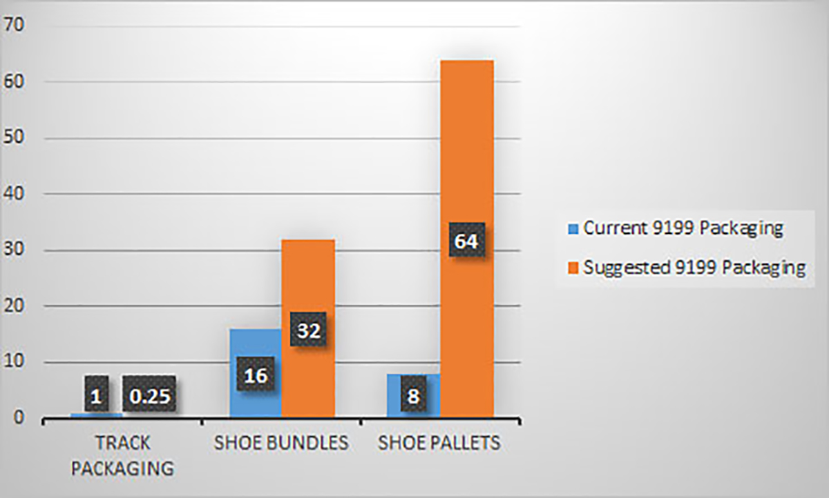 Working together, they realized how bundling 9119 vehicle replacement shoe track could be simplified resulting in time and cost savings. They noticed that 9199 track is currently bundled in accordance with a special packaging instruction that requires one piece of packaging material for each slab (eight shoes) of track, and 16 shoes are banded together to make a bundle. Each bundle requires seven pieces of banding and two bundles (32 shoes) are on each pallet. The suggestion is to bundle 9199 track similar to 4444 track, a structurally similar form of track that uses only one piece of packaging material for every four slabs of track, resulting in 32 shoes per bundle and 64 shoes per pallet.