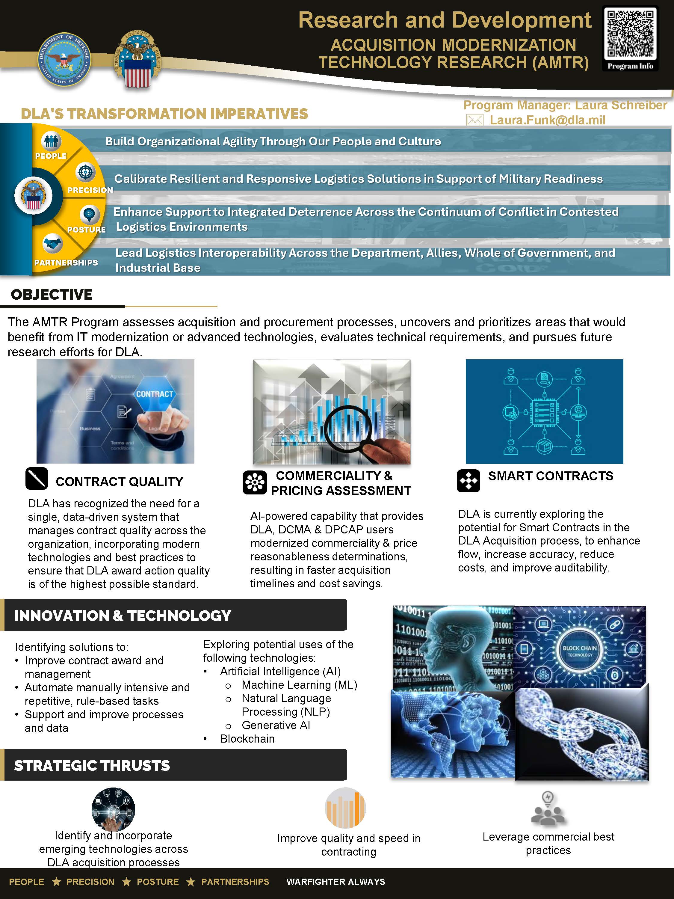 DLA Research & Development's Acquisition Modernization Technology Research Program assesses acquisition and procurement processes, uncovers and prioritizes areas that would benefit from IT modernization or advanced technologies, evaluates technical requirements, and pursues future research efforts for DLA.