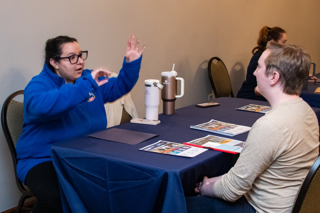 Michelle Louras, human resources specialist, Defense Logistics Agency Human Resources Services, interviews an applicant during a hiring event hosted by DLA Distribution Susquehanna at a career fair hosted by DLA Installation Management at Susquehanna Family Morale, Welfare and Recreation at the Susquehanna Club in New Cumberland, Pennsylvania, Feb. 26. (DoD photo by Thomas Zimmerman, released)