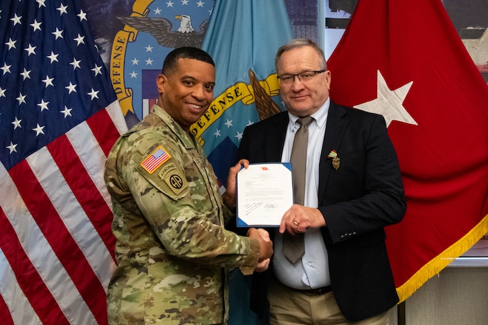 Army Brig. Gen. Kevin Cotman, commanding general, Defense Logistics Agency Distribution, presents a one-star note to Gene Surmacz, chief of staff, DLA Distribution, during his retirement ceremony at DLA Distribution headquarters in New Cumberland, Dec. 16. (DOW photo by Dorie Heyer, released)